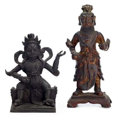 The tallest standing over bracket base, signs of gold and red lacquer, together with a seated model.