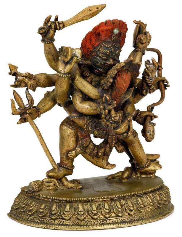 Two part casting, multi-armed deity with consort surmounts D-shaped lotus cast base.