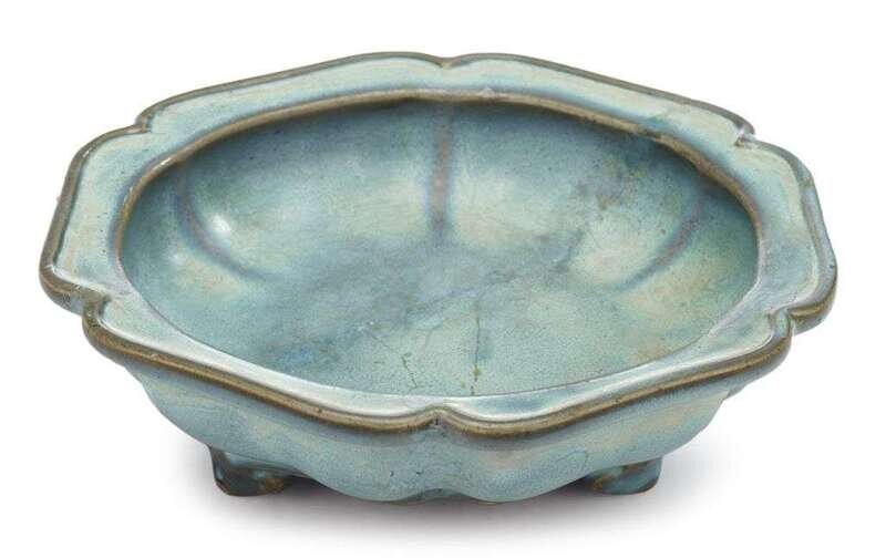 Foliate rim, raised on carved feet, blue to purple glaze, brown base, repaired.