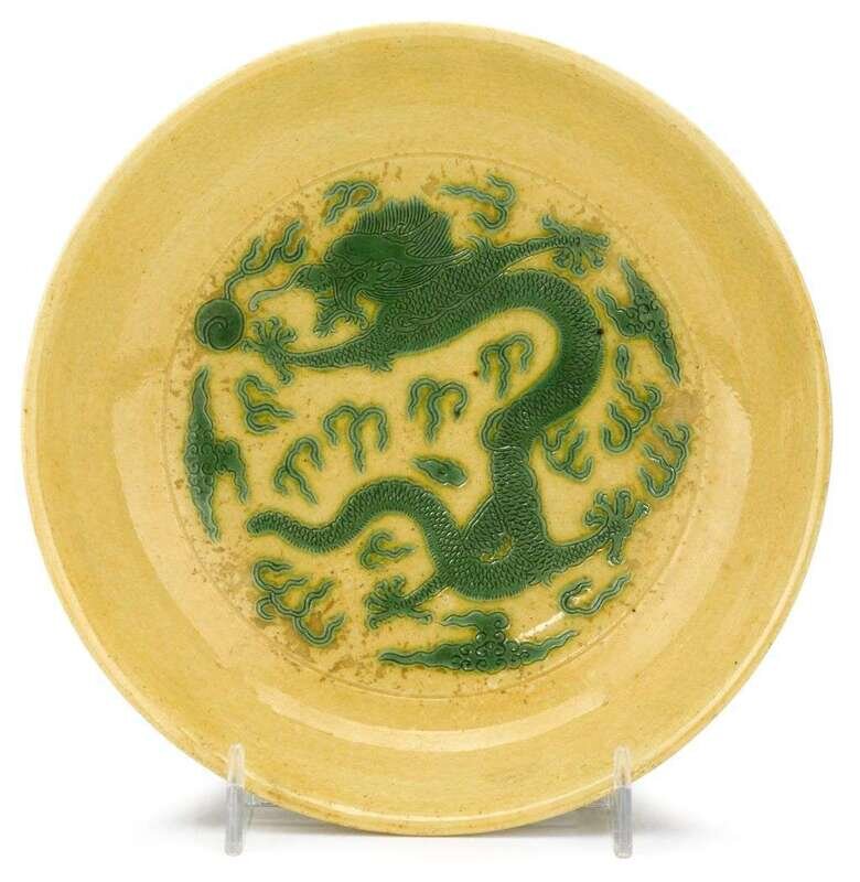 Chinese yellow and green glazed 'dragon' saucer dish guangxu mark and of the period