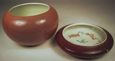 The largest of deep U-shape and near alms bowl form, solid glaze to outer wall, blue qianlong mark to base, together with shallow coupe with blue and copper-glazed aquatic subjects to interior, white glazed base.
