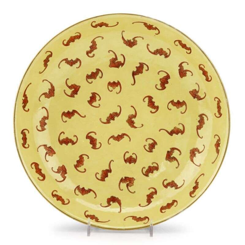 Dowager-style palette of iron-red bats on yellow ground, gilded rim and sprigs to underside, mark to base.
