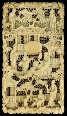 Tall rectangular from, carved to show detailed figural landscape with central plaque.