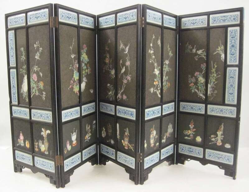 Chinese five panel famille rose and porcelain insert screen