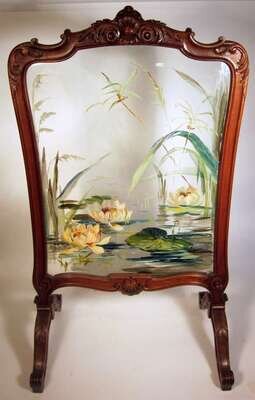 The acanthus scroll carved frame enclosing a glass panel painted to show a lily pond, raised on scroll legs.