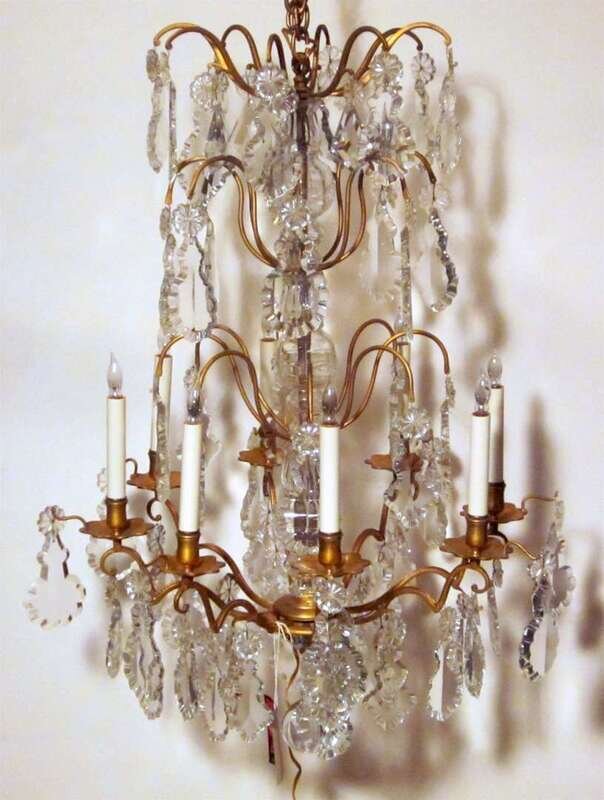 Louis XVI style eight branch gilt bronze and luster chandelier
