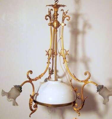 The central standard terminating in central light under opaque glass dome, and issuing three scrolling arms terminating in shaped glass shades.