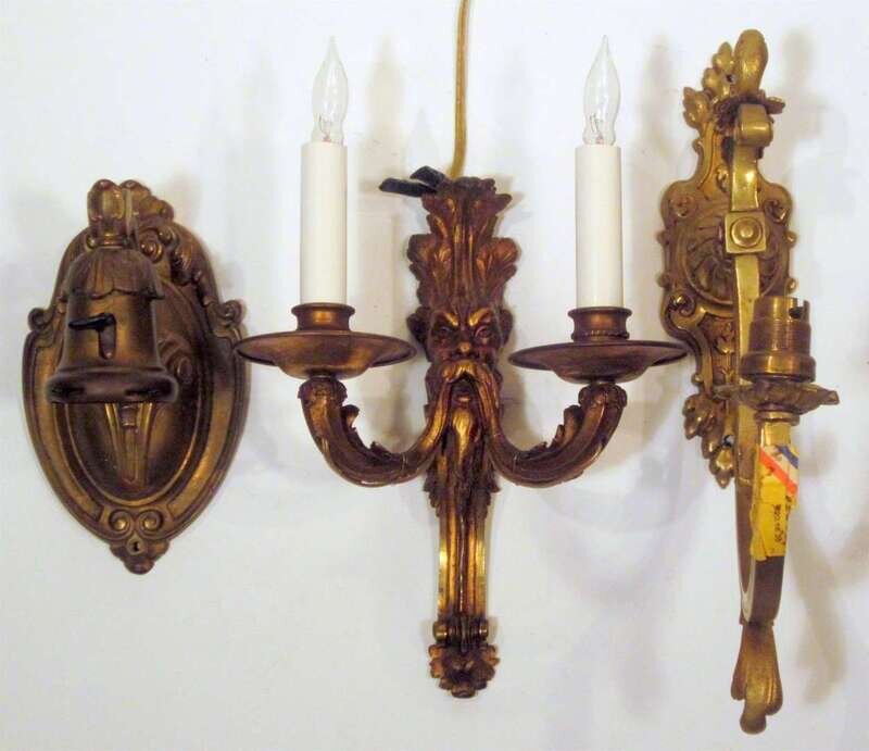 Comprising a two-arm sconce cast as a mask, the moustache issuing the two branches; a bell-form sconce, and an acanthus scroll single branch sconce. (3).