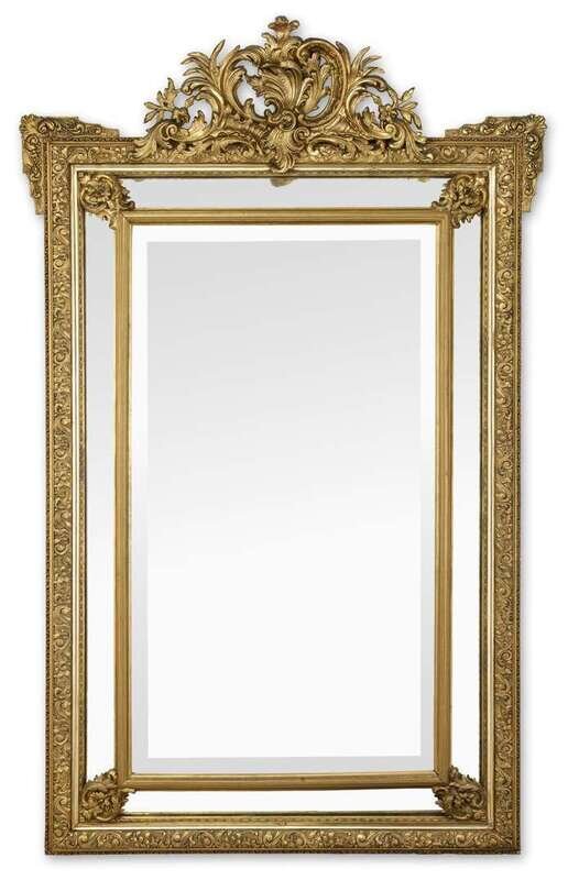 The C-scroll cartouche over scroll molded conforming rectangular frame, enclosing bevelled glass mirror plate.