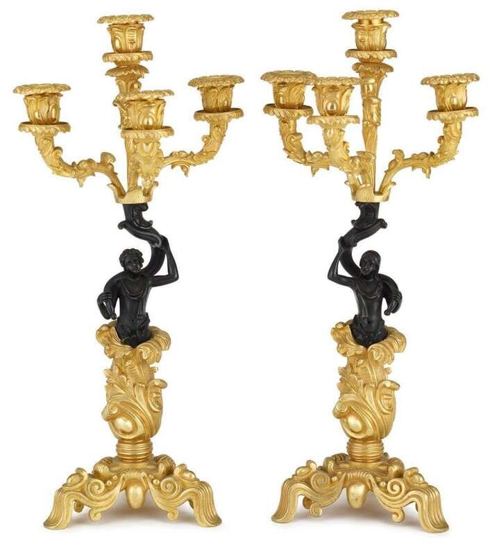 The acanthus scrolled standard issuing a patinated bronze maiden holding a cornucopia issuing four acanthus scrolled gilt bronze candle arms.