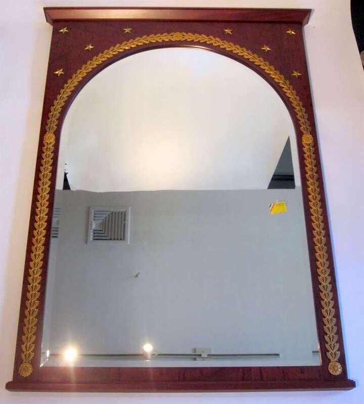 The straight molded top over arched top mirror plate, surrounded by gilt bronze stars and olive branch border.