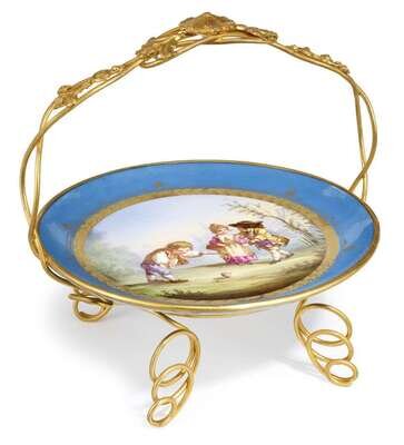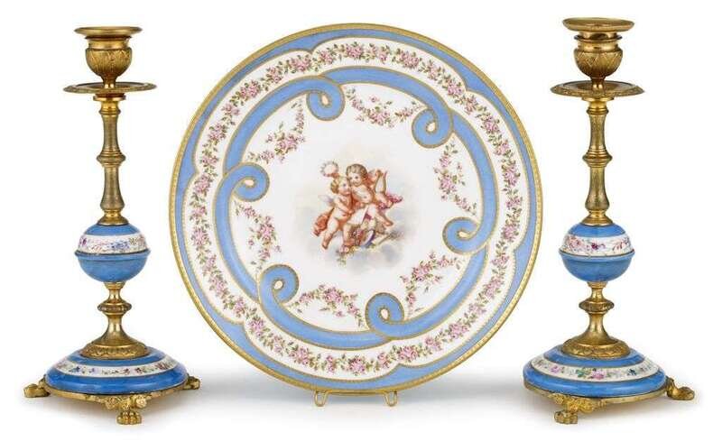 The urn-form nozzle above a central standard incorporating a blue ground porcelain knop painted to show flowers, over a conforming circular base raised on paw feet; together with a Sevres blue ground porcelain cabinet plate painted with putti surrounded by garlands of flowers, bearing Chateau de St Cloud and Sevres mark dated 1836. (4).