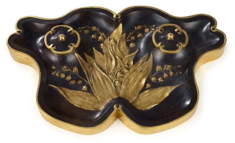 Stylised leaf form, with two lidded inkwells flanking a leaf and floral spray on a patinated bronze ground.