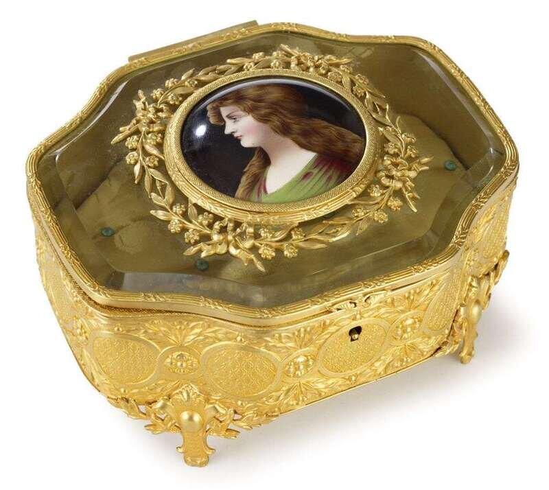 French gilt metal, glass and porcelain mounted jewelry casket late 19th/early 20th century