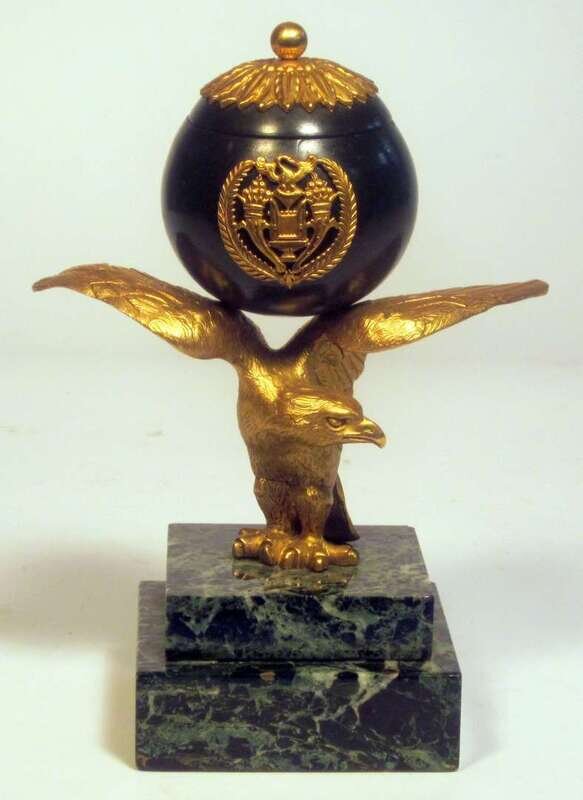 The globular hinged inkwell with acanthus finial, resting on the wings of a gilt bronze eagle, mounted on a verde antico marble base.