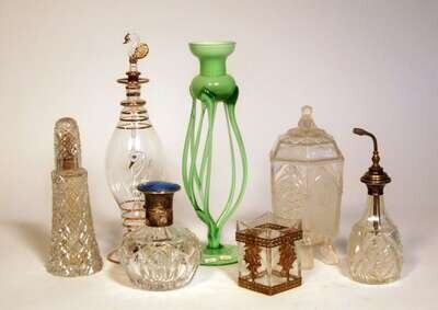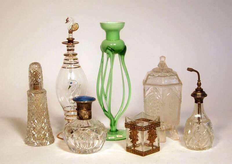 Comprising a cut glass perfume bottle with silver and guilloche enameled lid, hallmarked W.G. Sother & co., Birmingham 1934; a Venetian blown glass perfume bottle, the stopper and interior with applied swans; a cut glass kerosene lamp; a frosted glass jam pot; a cut glass perfume atomiser; an art glass candlestick; and a small glass bronze mounted cigarette holder in the Empire style. (7).