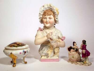 Modeled to show the young girl wearing a bonnet and white dress, both with pink bows, on a square base, incised marks 1537 and 28, and iron red mark 13 to underside; together with a Frankenthal figure group modeled to show a courting couple in eighteenth-century dress, raised on rococo scrolled base; and a circular ceramic pot, the lid transfer printed with a classical scene. (3).