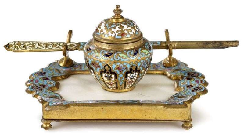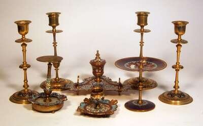 Comprising two inkstands with single inkwells, one with dip-pen; a small candlestick; a candlestand; two pairs of candlesticks and a small tazza, all well enameled to show scrolls and floral motifs in various colors. (9).
