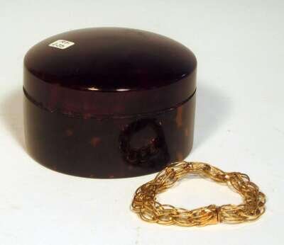 The looped and spiral twist chain connected by a heart-shaped clasp; together with a circular tortoiseshell box. (2).