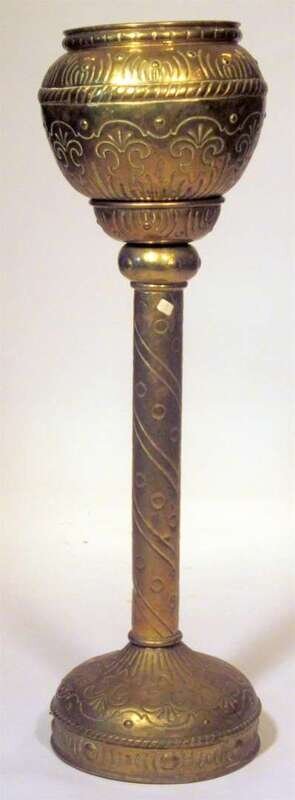 The brass basin over straight column terminating in circular base worked to show fleur de lis.