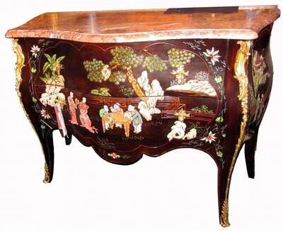 The shaped marble top over conforming case of two drawers sans traverse, decorated in the chinoiserie style, mounted with chutes ending in sabots.