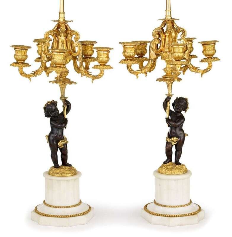 Each cast as a patinated bronze putti holding aloft acanthus scrolled candle arms, raised on a fluted white marble cylindrical pedestal. Now wired for electricity.