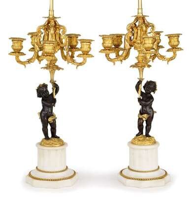 Good Pair of French gilt and patinated bronze candelabra late 19th century, in the manner of clodion