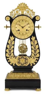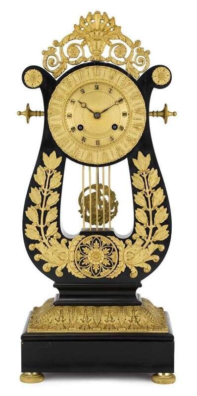 The circular dial with roman numerals within leaf-tip border, in a lyre-form support, raised on rectangular leaf-cast base raised on circular engine-turned feet.