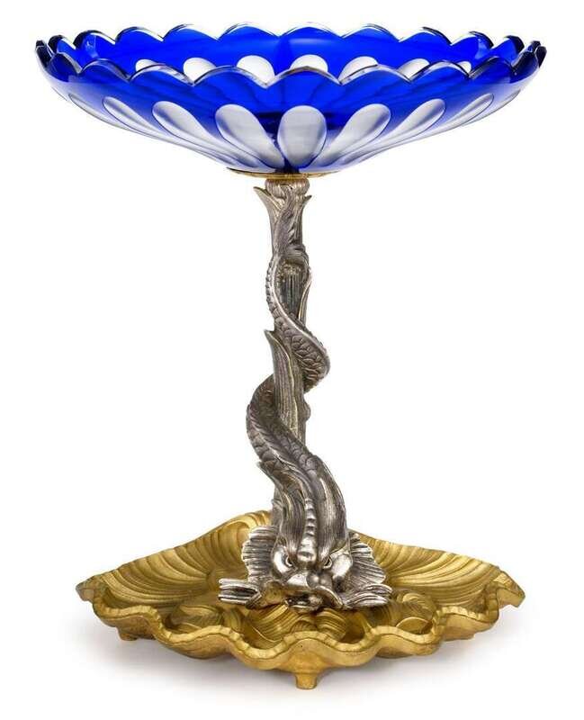 The blue and colorless glass fluted circular top over central silverplated stand cast as a stylised dolphin, raised on gilt bronze scallop form base.