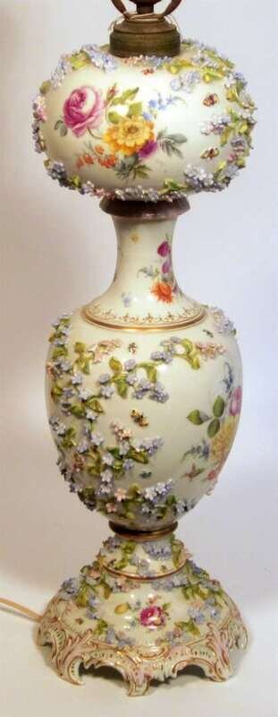 The orb top over baluster form vase raised on circular rococo-scrolled socle, the whole floral encrusted and painted to show insects and floral sprays.