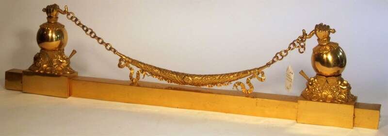 Each cast as orbs above windheads in clouds, united by a central bar and free moving chain cast as a laurel swag.
