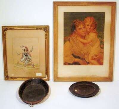 Cast to show a stylised fish beneath a crown; together with a Renaissance revival bronze plate; a Continental collage picture depicting a gallant (possibly Don Quixote), overlaid in white and pink metal, a countryside scene incorporating a windmill in the background; and a Continental lithograph depicting a mother and child. (4).