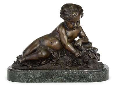 Bronze, dark brown patina, modeled to show the boy grasping a butterfly, surrounded by flowers on a naturalistic base, raised on verde antico marble base.