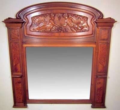 French art nouveau burl walnut and mahogany overmantel mirror early 20th century