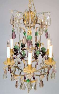 Hung with colorless cut glass and colored lusters in the form of grapes and leaves.