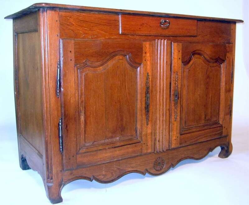The rectangular top over twin cupboard doors, over conforming apron and scroll feet.