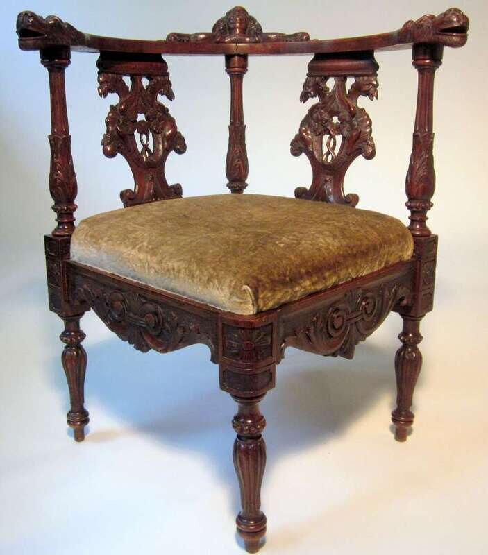 The carved top rail over back centered by a mask and arms terminating in lion's masks, over two griffon form splats above drop in seat raised on fluted tapering legs.
