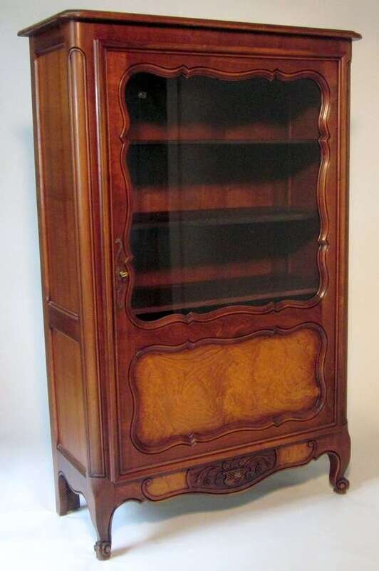 The shaped top over glazed and panelled door enclosing shelves, raised on short cabriole legs.