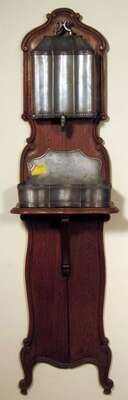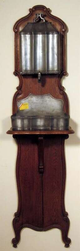 The shaped carved back supporting a pewter cistern with tap, and a lower shelf supporting a basin. Pewter stamps to basin.
