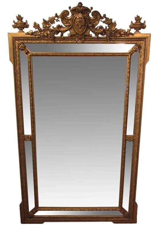 The cartouche crested top flanked by berries and vines, with two urns at the upper corners, above leaf-tip molded frame, enclosing rectangular mirror plate.