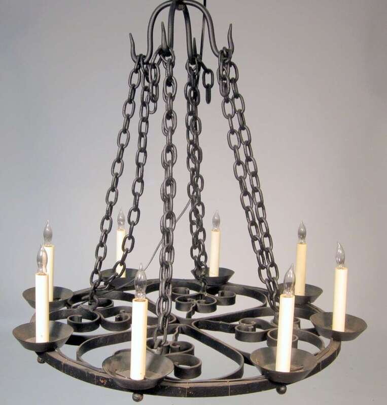 The circular scrollwork frame hung from a chain, issuing eight electrified lights.
