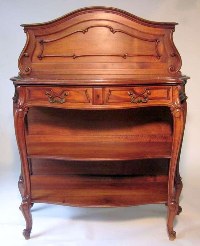 The rouge marble top of serpentine outline, above two conforming drawers, with two conforming tiers below, raised on cabriole legs.