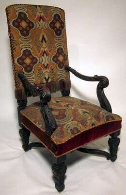 The needlework upholstered back over scroll arms, raised on stuff-over seat and tapering legs united by X-frame stretcher.