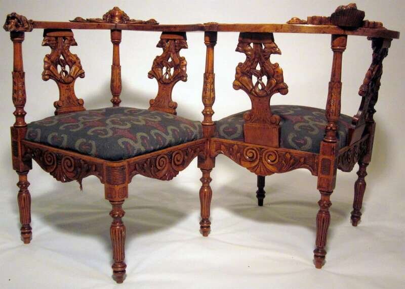 The inverse S-shaped top rail carved to show putti masks and lion's heads, above drop in seats and conforming apron, raised on fluted tapering legs.