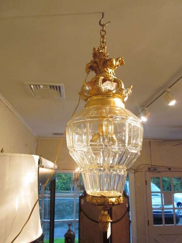 The leaf cast top above large faceted glass shade, terminating in conforming base issuing berry cast drop finial.