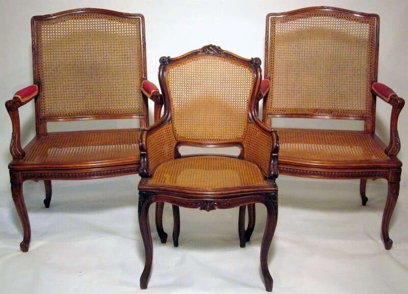 The molded top rail over padded scrolling arms, above shaped seat raised on cabriole legs; together with a carved cane upholstered child's bergere. (3).