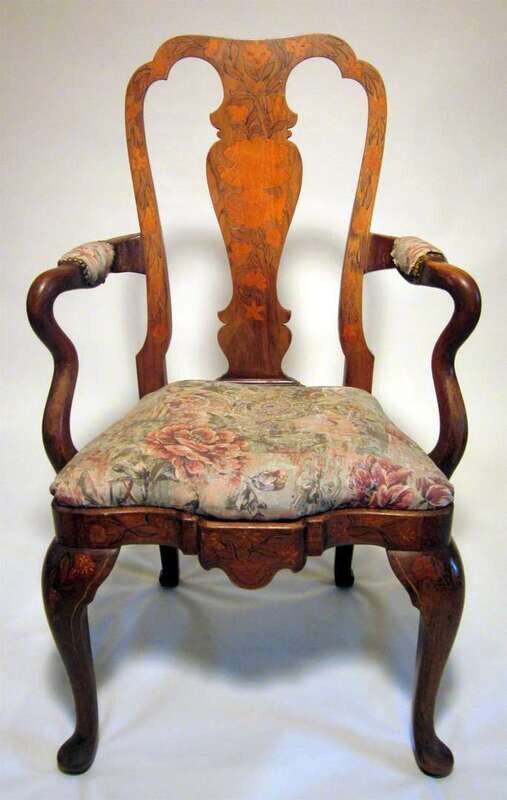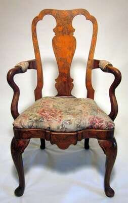 The shaped top rail over vasiform splat, above drop-in seat raised on cabriole legs.