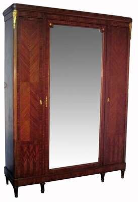 The shaped top over central mirror glazed cupboard door flanked by two quarter veneered smaller doors, raised on short fluted tapering legs terminating in brass caps.