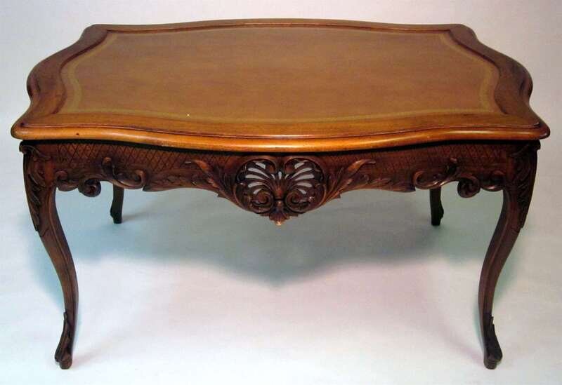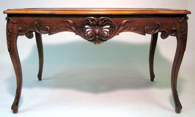 The serpentine leather inset marble top over C-scroll and lattice carved apron, raised on acanthus-capped cabriole legs.