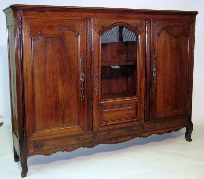 The rectangular top over three cupboard doors, the central door glazed, raised on conforming carved apron and short cabriole legs.
